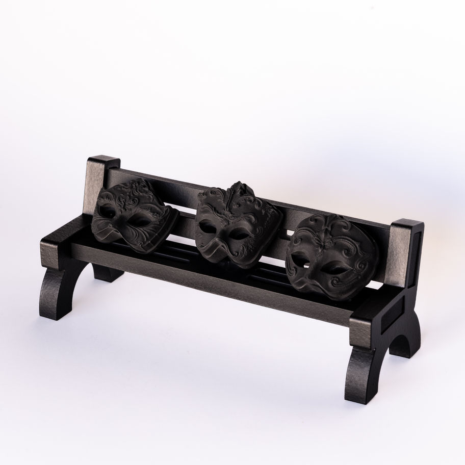 Rankų darbo gipsinis suoliukas ir trys mini kaukės – tai subtili interjero detalė, kuri primena apie ramybę, teatrą, emocijas ir grožį, slypintį paprastume.